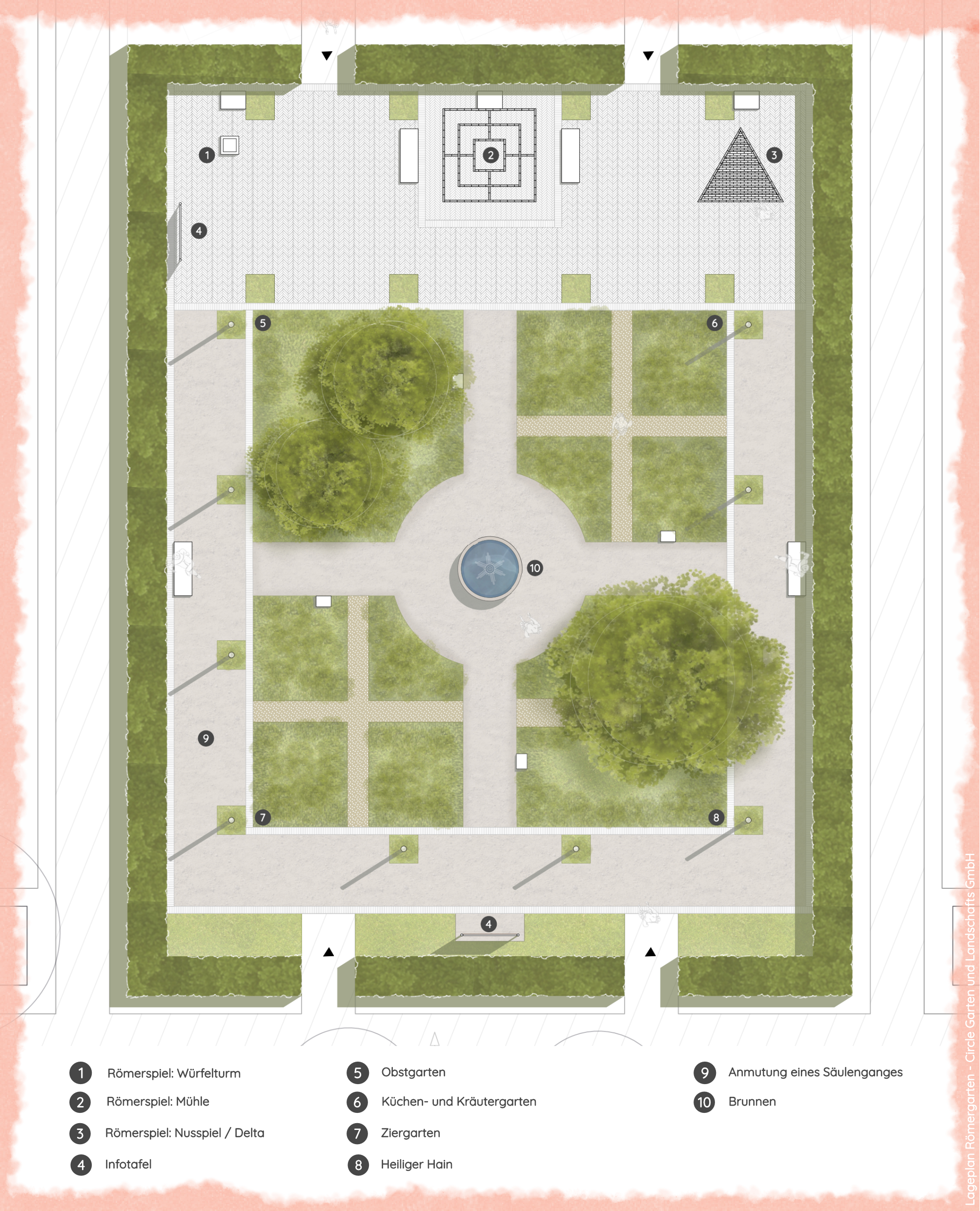 Im Römergarten der LAGA 2026 lassen wir diese antike Pracht wieder aufleben. Wandeln Sie auf römischen Pfaden durch einen prachtvollen Innenhof, der einer historischen Stadtvilla (Villa Urbana) nachempfunden ist. Umgeben von einem klassischen Säulengang (Peristyl) und dem sanften Plätschern eines Brunnens, verschmelzen hier Architektur und lebendige Natur zu einem Ort der Muße. Was Sie erwartet: